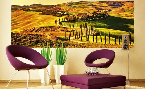 - Transform your walls with the Dimex Tuscany Un-Pasted Wall Mural. This 12’3″ x 4’9″ mural features a stunning Tuscan landscape design, bringing elegance and charm to any room.