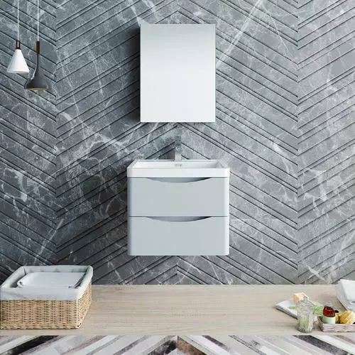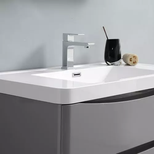 With its stylish Glossy Gray finish, the Fresca Tuscany Wall Hung Modern Bathroom Vanity adds a contemporary touch to any bathroom. The cabinet offers great storage with soft-closing drawers, just perfect for organizing all of your daily essentials. The drawers feature integrated handles that beautifully complement the minimalist look. Gracing the top of the cabinet is an eye-catching white acrylic-resin countertop/sink with a unique rimmed edge and integrated overflow. The sink has been pre-drilled to accommodate a single hole faucet (included). The set also includes p-trap, pop-up drain and installation hardware. This ensemble comes with a fully mirrored medicine cabinet with two adjustable glass shelves, to complete the look. This chic vanity is available in multiple colors and makes a stylish statement in any home.