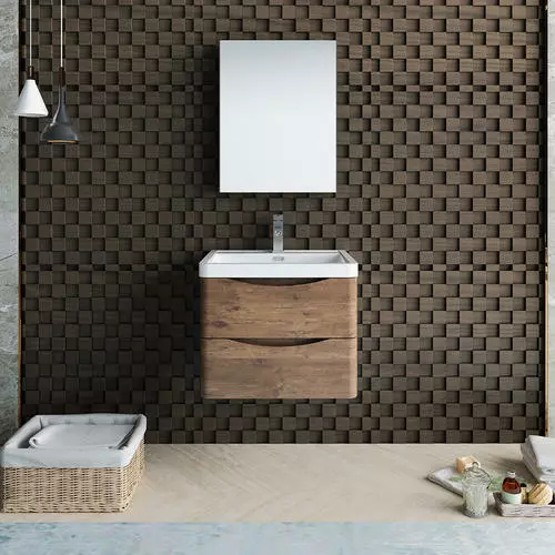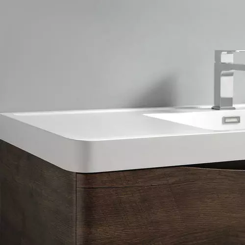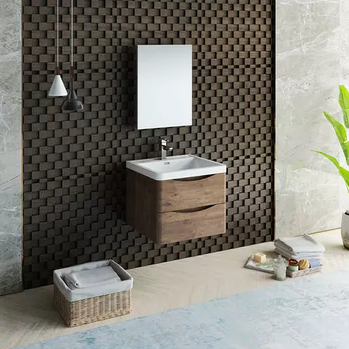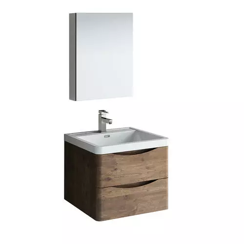 With its stylish Rosewood finish, the Fresca Tuscany Wall Hung Modern Bathroom Vanity adds a contemporary touch to any bathroom. The cabinet offers great storage with soft-closing drawers, just perfect for organizing all of your daily essentials. The drawers feature integrated handles that beautifully complement the minimalist look. Gracing the top of the cabinet is an eye-catching white acrylic-resin countertop/sink with a unique rimmed edge and integrated overflow. The sink has been pre-drilled to accommodate a single hole faucet (included). The set also includes p-trap, pop-up drain and installation hardware. This ensemble comes with a fully mirrored medicine cabinet with two adjustable glass shelves, to complete the look. This chic vanity ensemble is available in multiple colors and makes a stylish statement in any home.