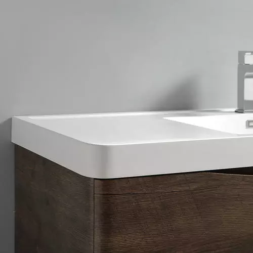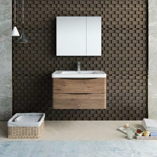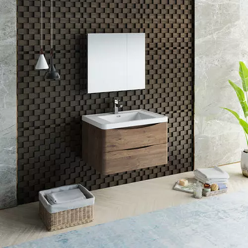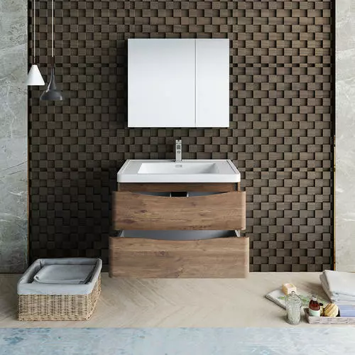 With its stylish Rosewood finish, the Fresca Tuscany Wall Hung Modern Bathroom Vanity adds a contemporary touch to any bathroom. The cabinet offers great storage with soft-closing drawers, just perfect for organizing all of your daily essentials. The drawers feature integrated handles that beautifully complement the minimalist look. Gracing the top of the cabinet is an eye-catching white acrylic-resin countertop/sink with a unique rimmed edge and integrated overflow. The sink has been pre-drilled to accommodate a single hole faucet (included). The set also includes p-trap, pop-up drain and installation hardware. This ensemble comes with a fully mirrored medicine cabinet with two adjustable glass shelves, to complete the look. This chic vanity ensemble is available in multiple colors and makes a stylish statement in any home.