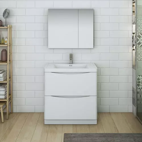 With its stylish White finish, the Fresca Tuscany Modern Bathroom Vanity adds a contemporary touch to any bathroom. The free standing cabinet offers great storage with soft-closing drawers, just perfect for organizing all of your daily essentials. The drawers feature integrated handles that beautifully complement the minimalist look. Gracing the top of the cabinet is an eye-catching white acrylic-resin countertop/sink with a unique rimmed edge and integrated overflow. The sink has been pre-drilled to accommodate a single hole faucet (included). It also includes p-trap, pop-up drain and installation hardware. This ensemble comes with a fully mirrored medicine cabinet with two adjustable glass shelves, to complete the look. This chic vanity ensemble is available in multiple colors and makes a stylish statement in any home.