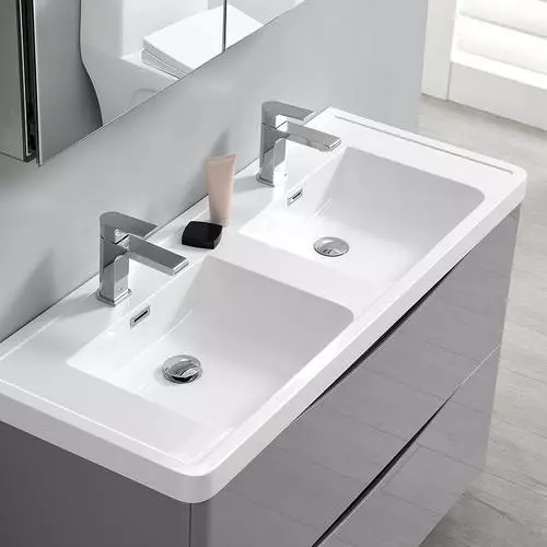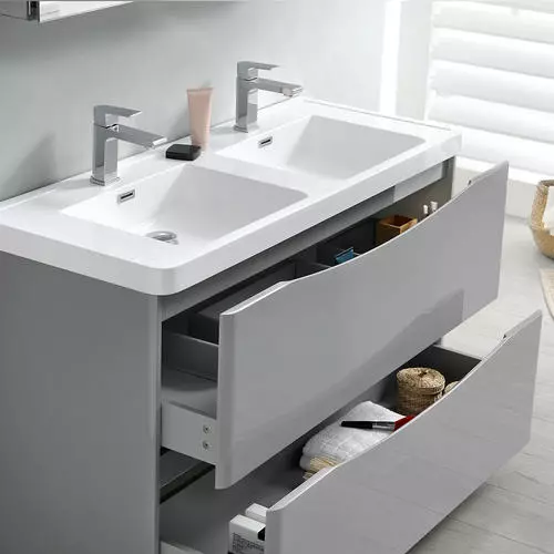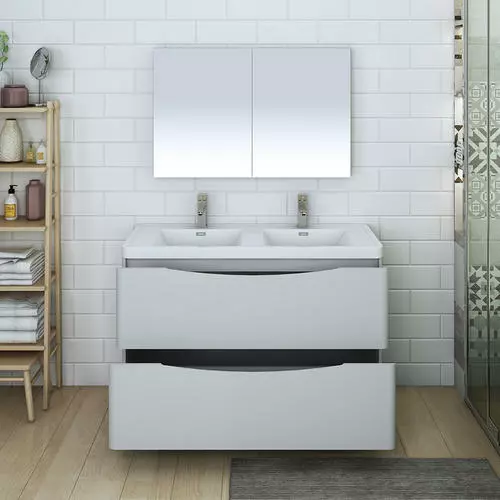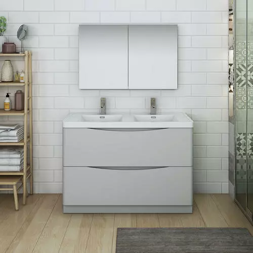 With its stylish Glossy Gray finish, the Fresca Tuscany Modern Double Sink Bathroom Vanity adds a contemporary touch to any bathroom. The free standing cabinet offers great storage with soft-closing drawers, just perfect for organizing all of your daily essentials. The drawers feature integrated handles that beautifully complement the minimalist look. Gracing the top of the cabinet is an eye-catching white acrylic-resin countertop/double sink with a unique rimmed edge and integrated overflow. The sinks have been pre-drilled to accommodate single hole faucets (included). It also includes p-trap, pop-up drain and installation hardware. This ensemble comes with a fully mirrored medicine cabinet with two adjustable glass shelves, to complete the look. This chic vanity ensemble is available in multiple colors and makes a stylish statement in any home.