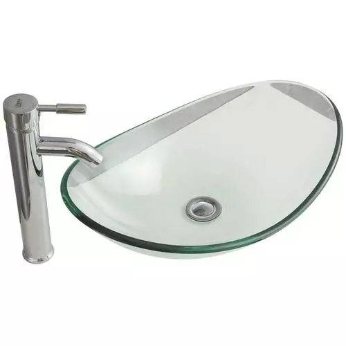 - The Tuscany® Glass Slipper Vessel Sink features a stunning transparent oval glass design, measuring 21-1/4″W x 6″D, making it a perfect fit for modern and luxurious bathrooms.