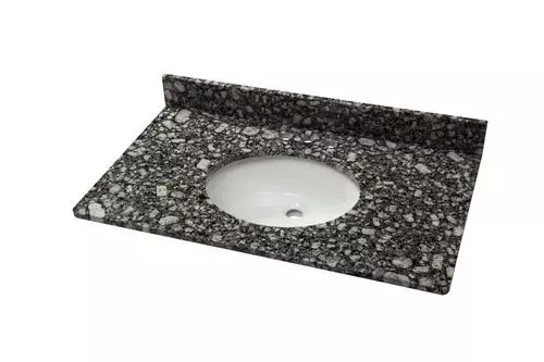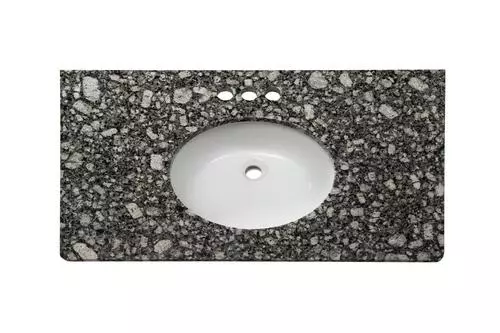 Update while adding value to your bathroom with this beautiful, durable, maintenance free 37″ long x 22″ deep x 3CM thick solid granite vanity top. Each and every piece of granite is a natural, unique, one-of-a-kind piece of art. The top includes a preinstalled vitreous china under mount bowl and is predrilled for a 4″ on center faucets of your choice. Each top also includes a matching backsplash as an option for installation.
