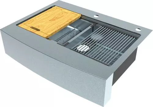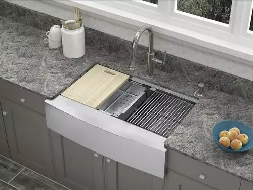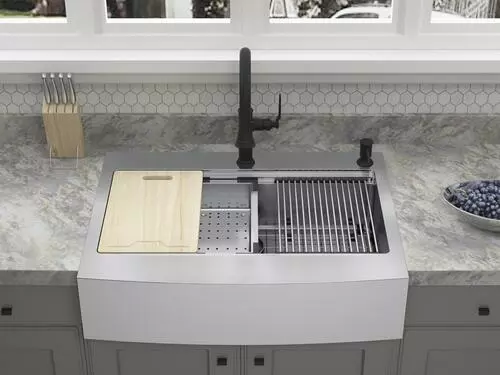 This work station sink includes a 33″ x 25″ x 8 ” single bowl apron front sink, cutting board, colander, drying rack, sink grid, 7 U-channel clips for top-mount and 7 fasteners for under-mount installation, installation instructions and installation templates for both applications. The 18 gauge stainless steel sink can be installed as a top-mount or under-mount. It will update any kitchen from drab to fabulous!