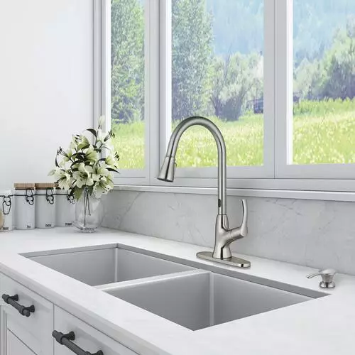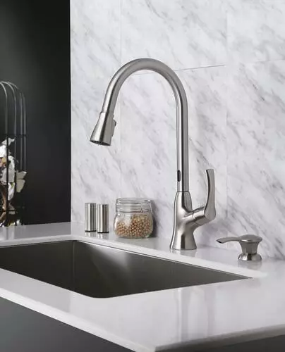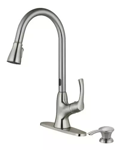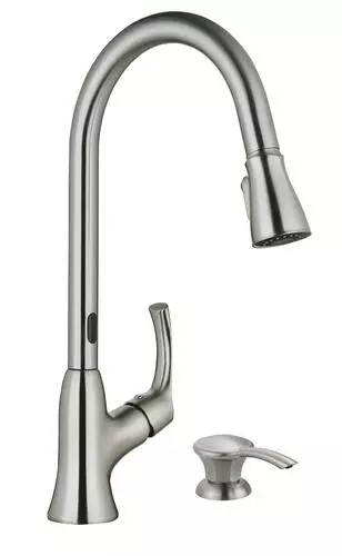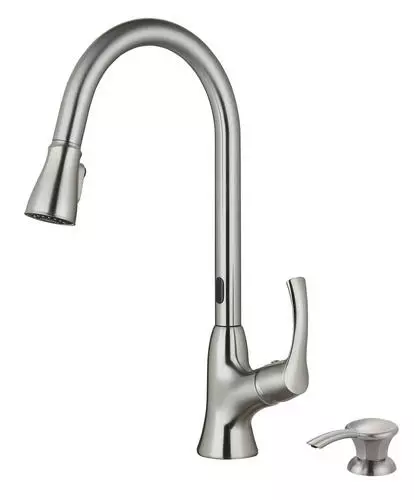The Altamont Touchless Sensor Single Handle Pull-Down Kitchen Faucet with Soap Dispenser is in a stainless steel finish. The faucet includes a locking deck plate for 1, 2, 3 or 4 hole installation. The Altamont has a sensor for an easy touchless operation. It has a 10-3/8″ high 120 degree swing spout, a pull down 60″ hose with a spray head that has two functions spray and stream and a premium grade ceramic cartridge for years of drip-free use. This faucet has a matching ABS soap dispenser that fills from above the counter for ease of use. The Altamont Touchless Sensor faucet will update any kitchen to a modern kitchen.