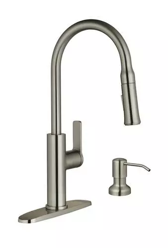 The Brittania single handle pull-down kitchen faucet with a matching soap dispenser comes in a stainless steel finish. This faucet can be installed using a 1, 2, 3 or 4 hole application using the included zinc deck plate. This faucet features an 18-5/16″ high and 8-5/16″ long spout. The plastic spray head has two functions; spray and stream. The copper waterway construction meets the AB 1953 low lead standards. All Tuscany single-handle kitchen faucets use a premium ceramic cartridge for years of drip-free use.