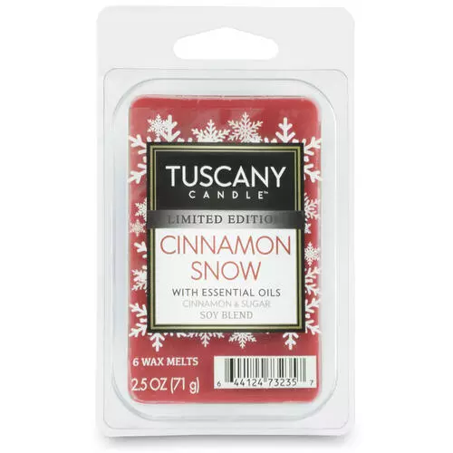 - Transform your space with the warm, cozy aroma of Tuscany Candle™ Cinnamon Snow Wax Melt. Each 6-pack delivers a long-lasting fragrance that creates a welcoming atmosphere.