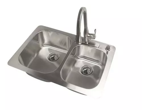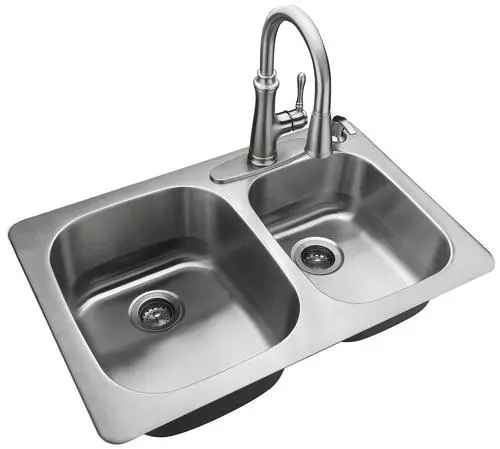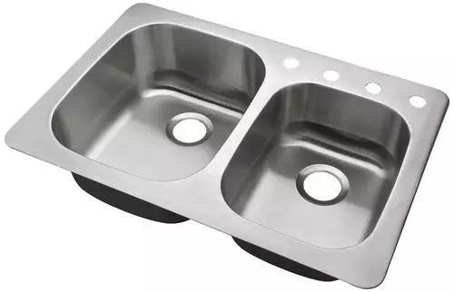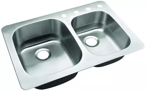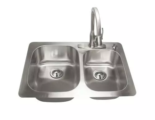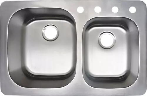 This dual-mount 33″ x 22″ x 9″ / 7-1/2″ offset double bowl has the large bowl on the left and the small bowl on the right. The special feature of this sink is the unique flat deck so it can be installed as a top mount or under mount. This premium 18 gauge T-304 stainless steel sink has 3 three faucet holes and one accessory hole with a lustrous satin finish will give your kitchen a functional and stylish look. The sink offers one piece construction with a latex coating sprayed underneath plus full size rubber pads to help absorb and deaden sounds and has 3-1/2″ drain openings. The sink includes mounting clips for both installation options, instructions and cut-out templates.