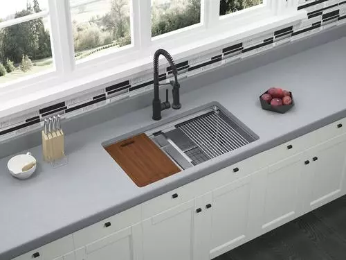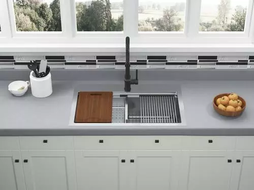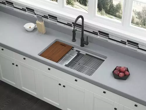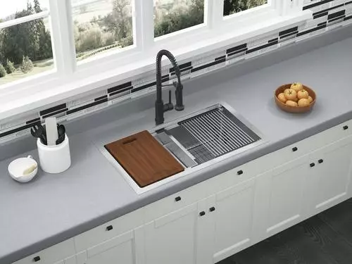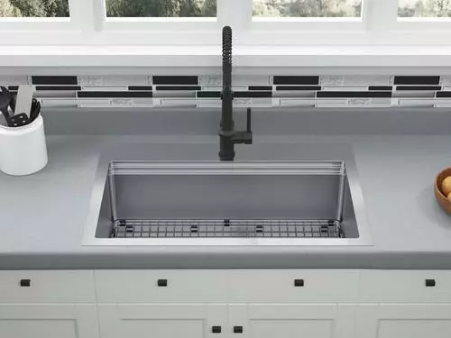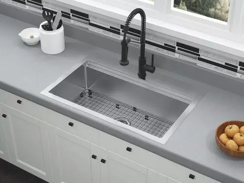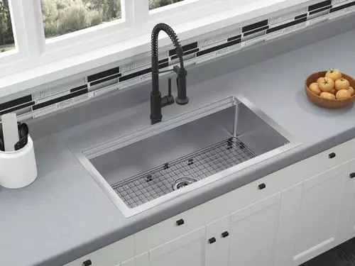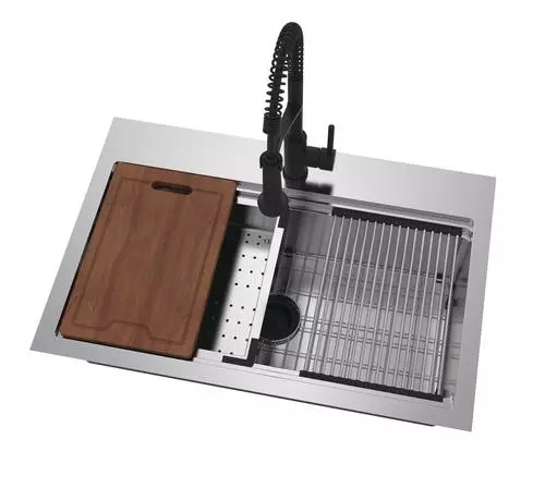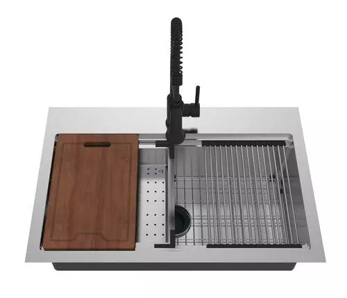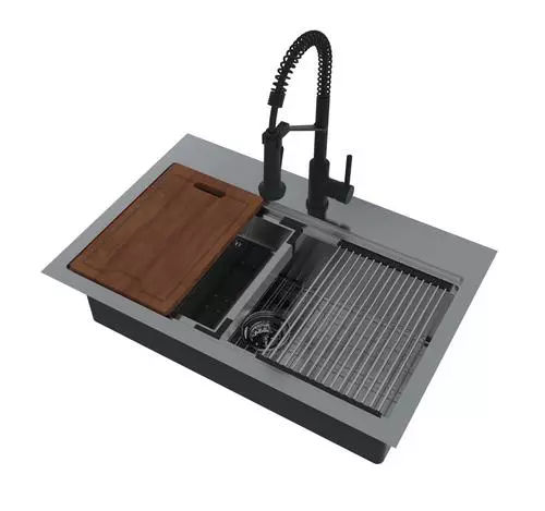 The Forden 33″ x 22″ x 9″ is a dual mount single bowl work station sink kit. This premium grade 304, 18 gauge stainless steel sink is fully coated underneath with a heavy duty sound deadening pad that helps insulate the bowl. The Forden comes with a one-handle pull-down kitchen faucet, sink grid, strainer, colander, cutting board, drying rack, U-channel clips, fasteners, installation instructions, cutout template and a limited lifetime warranty.