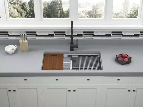 - Includes kitchen sink, kitchen faucet, colander, cutting board, drying rack, and strainer