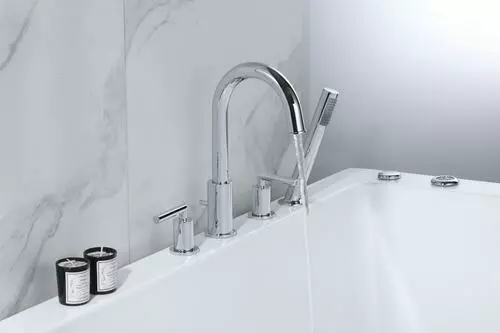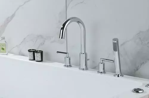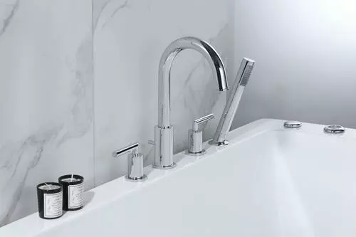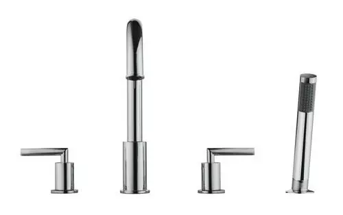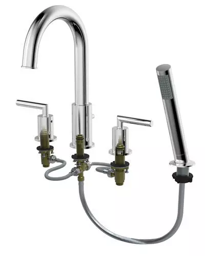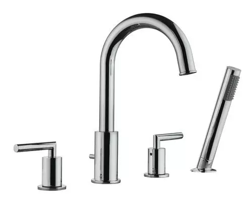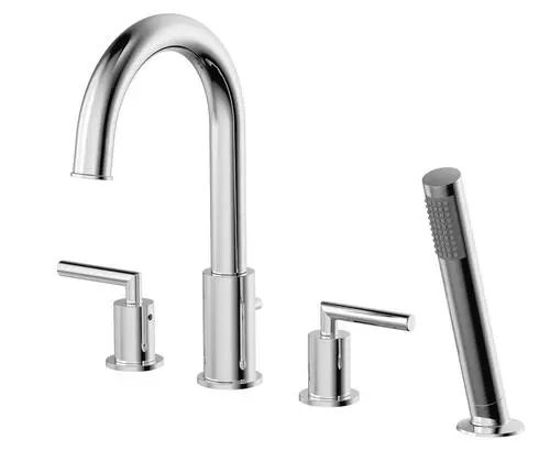 The Tuscany Forden roman tub faucet with an optional single function handheld showerhead can be installed with or without the handheld showerhead (hardware for both installations included). The widespread design featuring the matching handheld showerhead has an 86″ stainless steel hose for ease of use. The brass spout with zinc handles also features 1/4 turn premium grade high flow rate ceramic disc cartridges for years of drip free use. The Forden widespread roman tub is in a polished chrome finish.