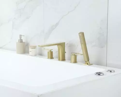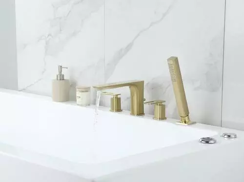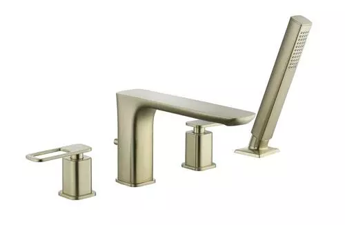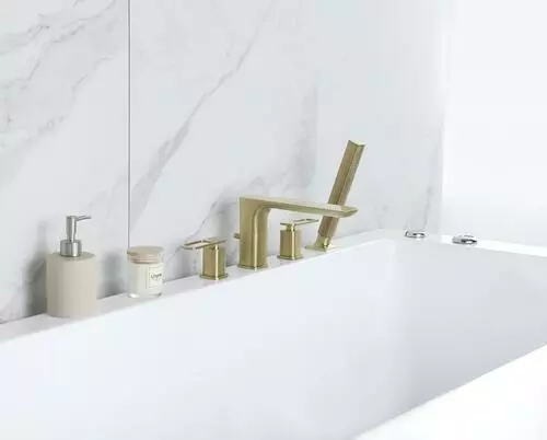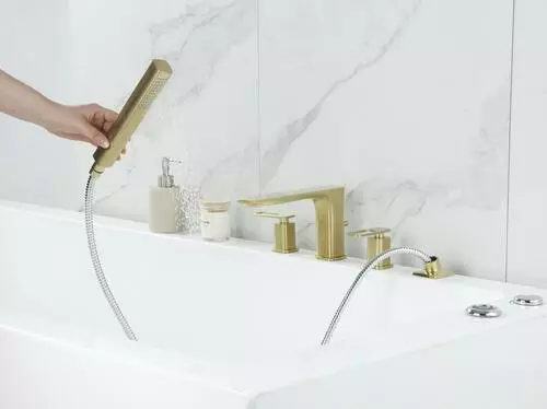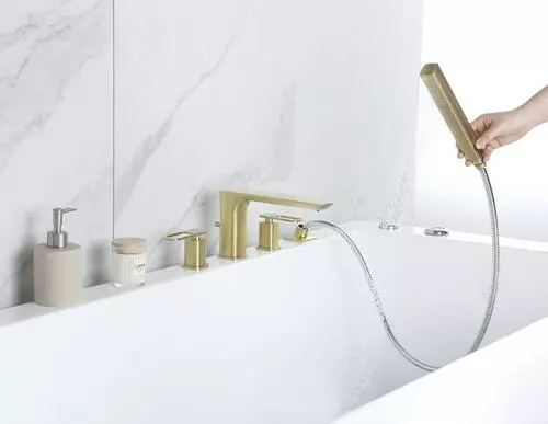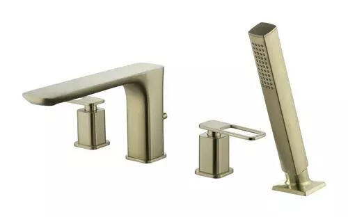 The Tuscany Gatineau roman tub faucet with an optional single function handheld showerhead can be installed with or without the handheld showerhead (hardware for both installations included). The widespread design featuring the matching handheld showerhead has an 86″ stainless steel hose for ease of use. The one piece solid cast brass spout with zinc handles also features 1/4 turn premium grade high flow rate ceramic disc cartridges for years of drip free use. The Gatineau widespread roman tub is in a matte gold finish.