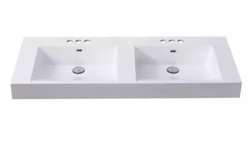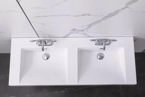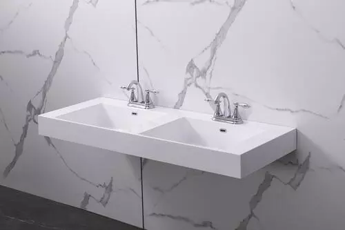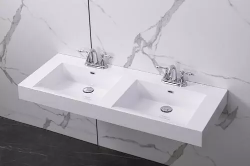 Beautiful 47″ x 18″ wall mount cultured marble bathroom sink with white finish for your bathroom, looks neat and clean. Simple design with double bowls and easy to install. Including mounting hardware.