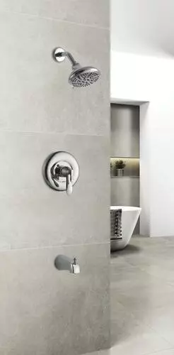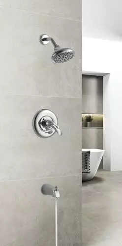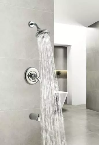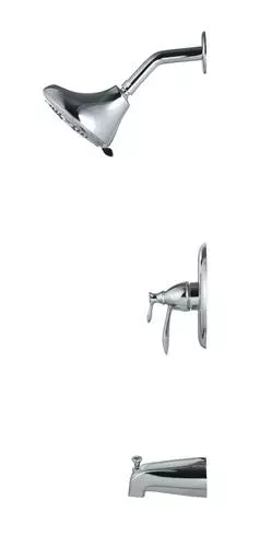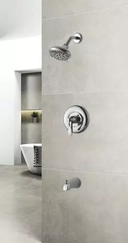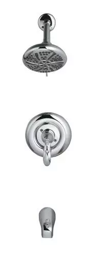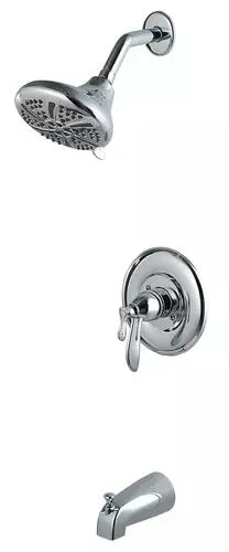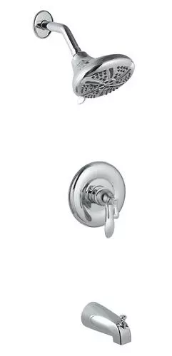 The Tuscany Marianna one-handle thermostatic tub/shower faucet in a polished chrome finish is an ideal safety feature for any bathroom. A large 5 1/2″ round showerhead features a 5 multi-function showerhead with a matching finish face plate and a 5″ tub spout for a wonderful bathing experience. This tub/shower valve has a number of solid construction features including solid brass waterways, integral stops and the option for back to back installation. All Tuscany tub/showers have a ceramic cartridge for years of drip-free use.