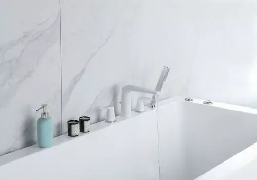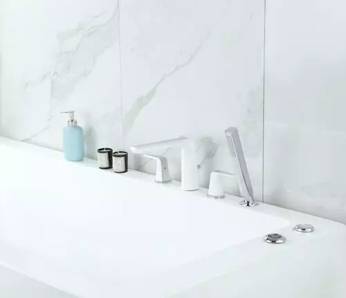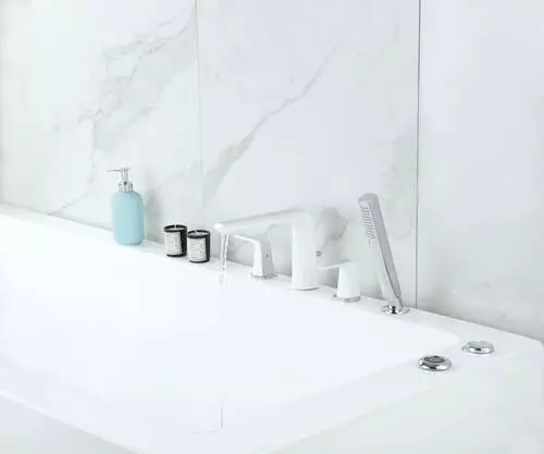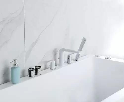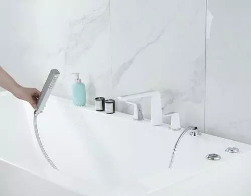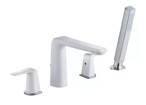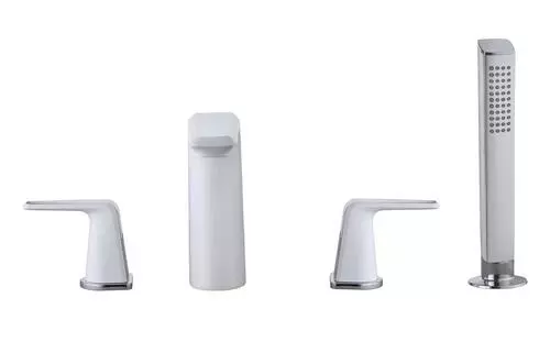 The Tuscany Navassa roman tub faucet with an optional single function handheld showerhead can be installed with or without the handheld showerhead (hardware for both installations included). The widespread design featuring the matching handheld showerhead has an 86″ stainless steel hose for ease of use. The brass spout with zinc handles also features 1/4 turn premium grade high flow rate ceramic disc cartridges for years of drip free use. The Navassa widespread roman tub is in a white and polished chrome finish.