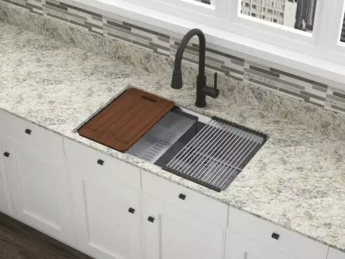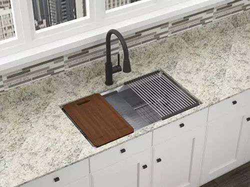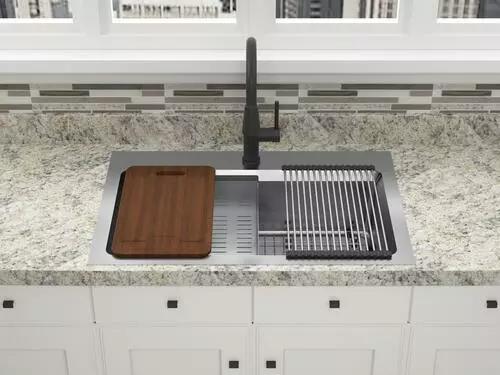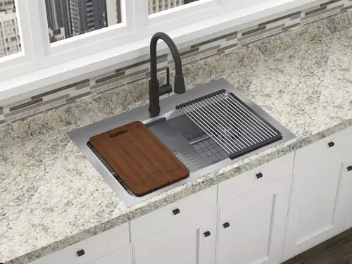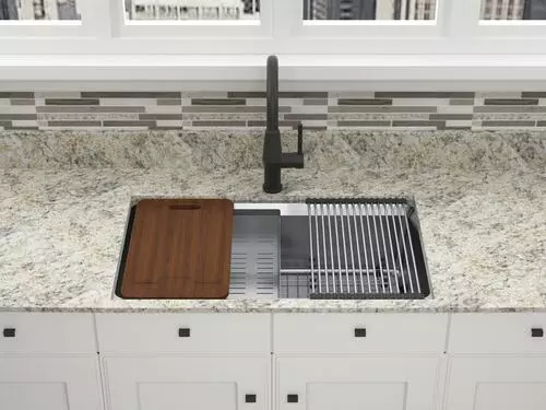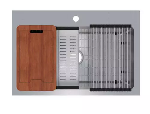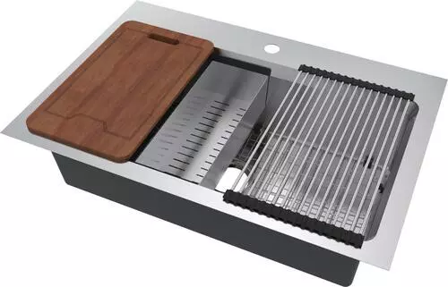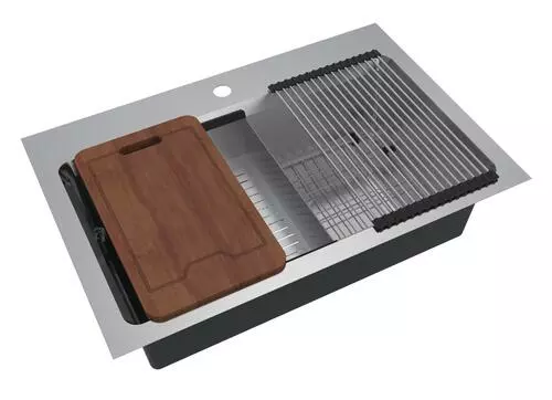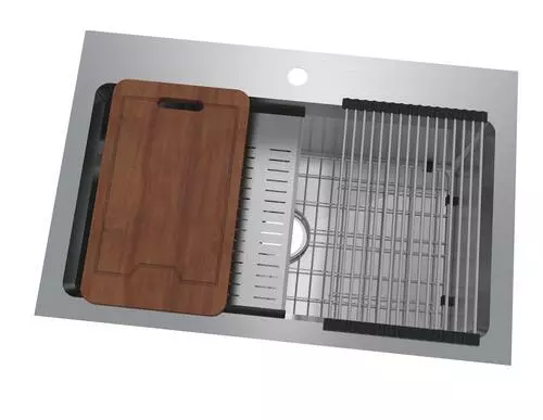 The Northchase™ 33″ x 22″ x 9″ is a dual mount single bowl work station sink. This premium grade 304, 18 gauge stainless steel sink is fully coated underneath with a heavy duty sound deadening pad that helps insulate the bowl. The Northchase™ comes with a sink grid, colander, cutting board, drying rack, U-channel clips, fasteners, installation instructions, cutout template and a limited lifetime warranty.
