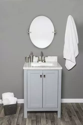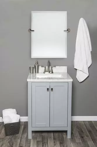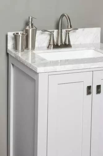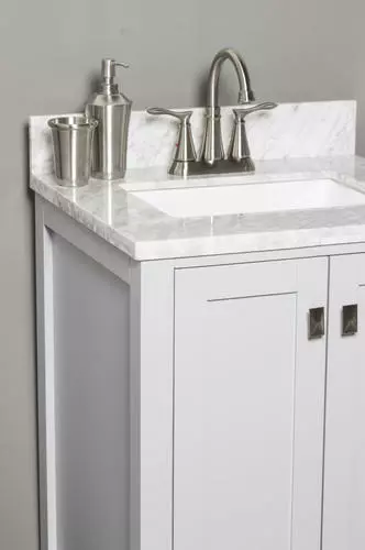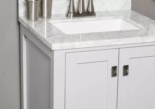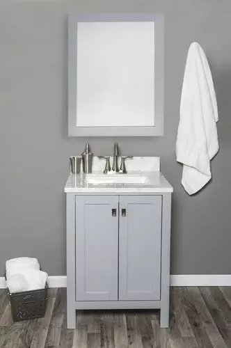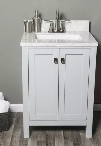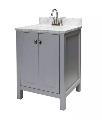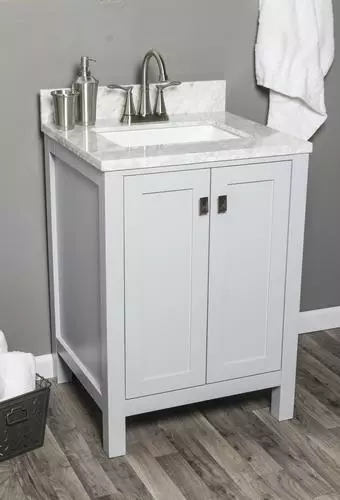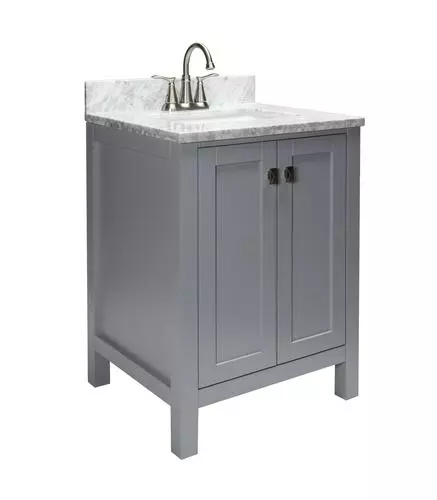 - Features a durable gray vanity paired with a luxurious natural Carrara marble top for a timeless, sophisticated look.
