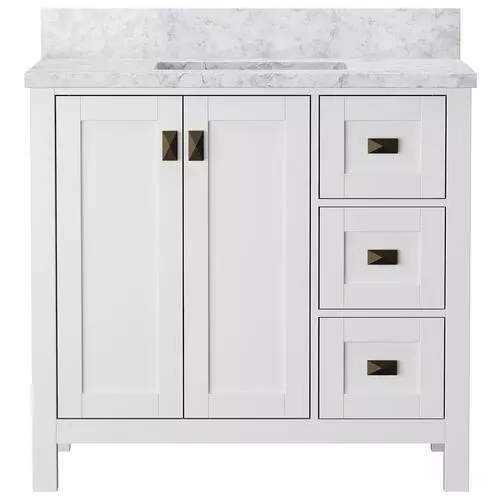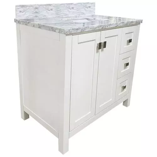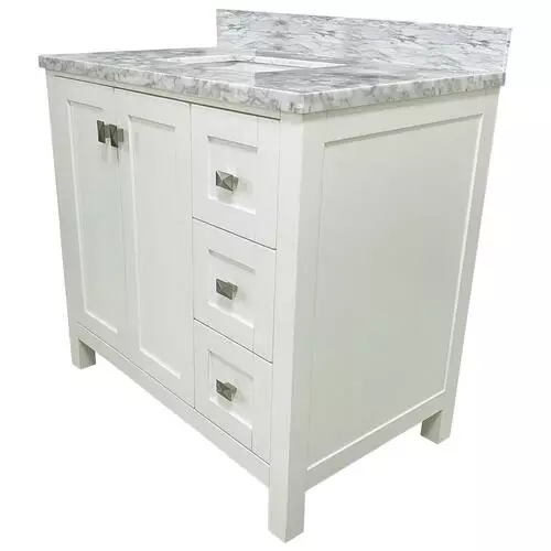 Tuscany® Rio 36″W x 22″D White Vanity with White Carrara Marble Top & Rectangular Undermount Bowl – Elegant Bathroom Storage Solution