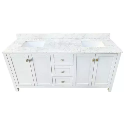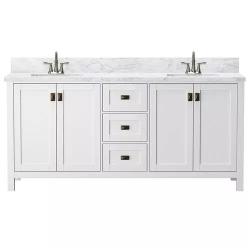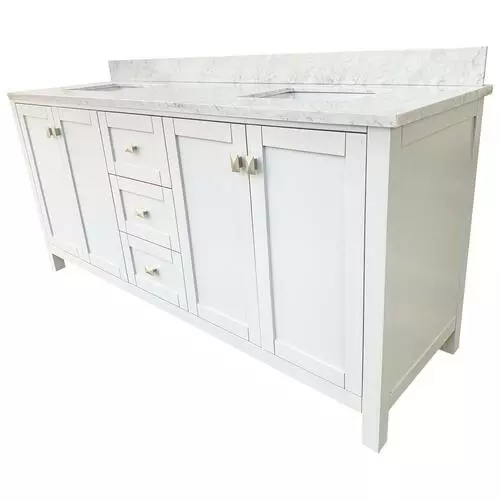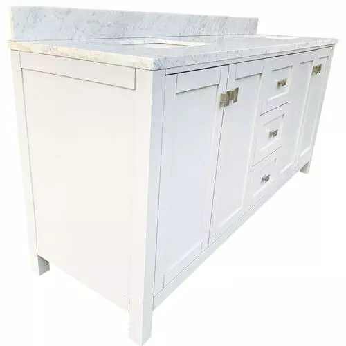 Tuscany® Rio 72″W x 22″D White Vanity with White Carrara Marble Top & Rectangular Undermount Bowls