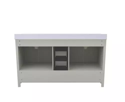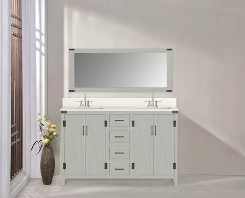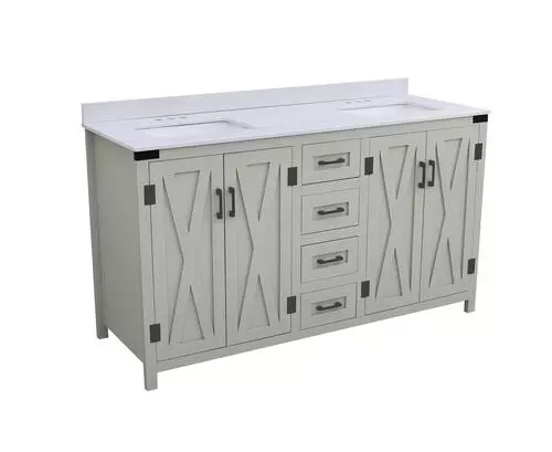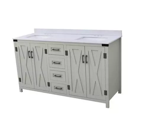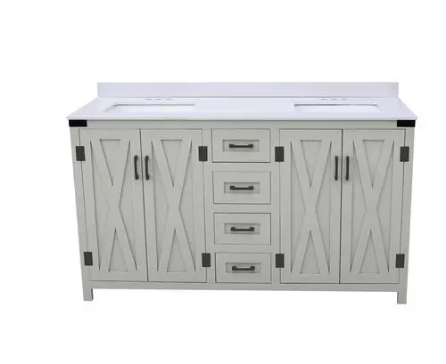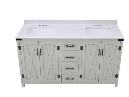 The Salerno Collection combines old world charm with a new-school farmhouse feel. The intricate cross-hatch door design provides a striking focal point, and the pop of the black rustic hardware completes the look. This vanity is capped with a white Cultured Marble top with undermount sink(s).