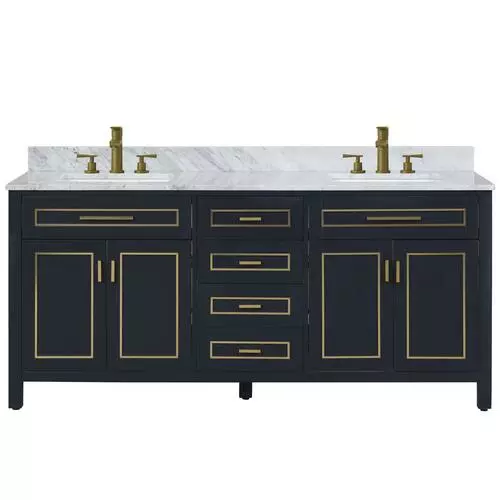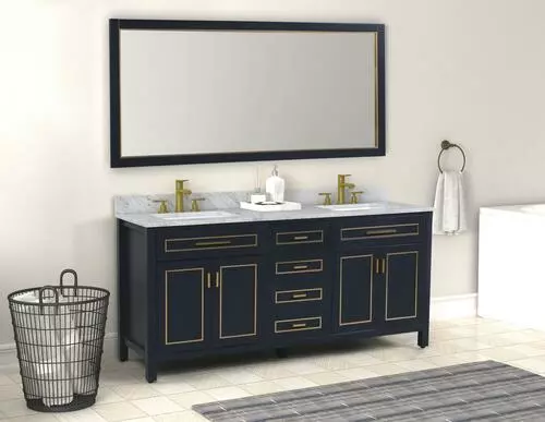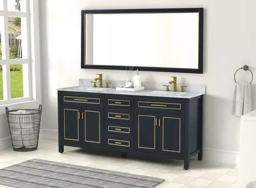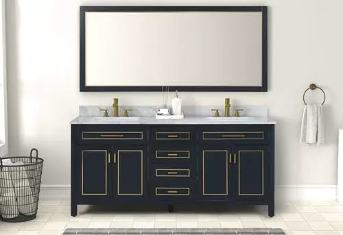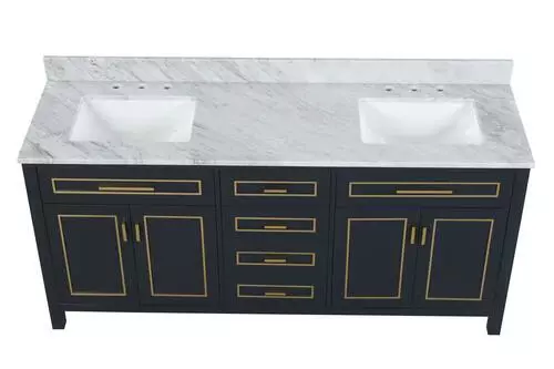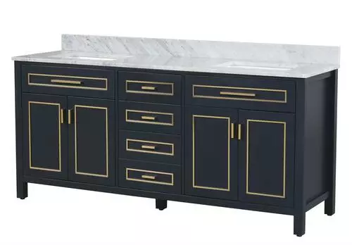 The Tirana Collection offers luxurious colored hardware, depending on the color of your vanity. This collection has a genuine carrara marble top and should be the best choice for your bathroom vanity