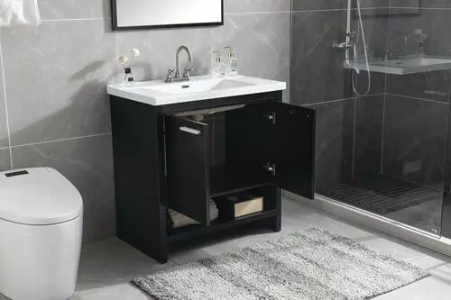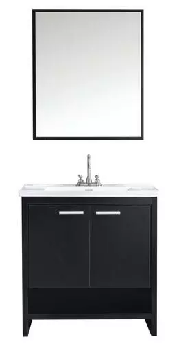 Verona 31-inch vanity is a free standing vanity with cUPC certified extra thick profile ceramic top drilled for a 4-inch faucet spread, two soft-close doors, one open-shelf for extra storage and mirror included