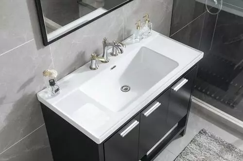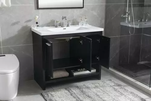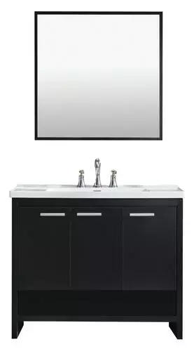 Verona 40-inch vanity is a free standing vanity with cUPC certified extra thick profile ceramic top drilled for a 8-inch faucet spread, three soft-close doors, one open-shelf for extra storage and mirror included