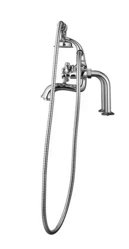 The Tuscany Victoria bath faucet with handheld showerhead in a polished chrome finish, will bring style to any bathroom. This faucet has the unique ability to be mounted on the deck or wall and comes with the hardware needed for either mounting option. Achieve the desired style you’re looking for with multiple mounting options. If you prefer a free-standing look, the floor mounting kit (673-6250), sold separately, is the perfect option. The hand-held shower features a 3″ shower head and a brass die cast spout. The flow rate for the hand-held shower is 2.5 GMP @ 80 PSI, while the spout flow rate is 7.0 GMP @ 80 PSI.