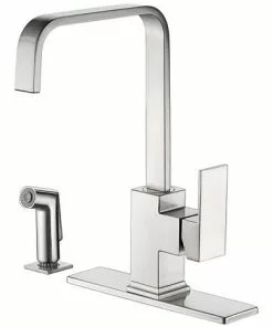 The Whitemore single handle pull-out kitchen faucet with a soap dispenser in a polished chrome finish has a clean modern design. This faucet can be installed using a 1, 2, 3 or 4 hole application using the zinc deck plate that is included. The 5-11/16″ high and 7-5/8″ long spout swings 125°. The plastic spray head has two functions; spray and stream. The copper waterway construction meet the AB 1953 low lead standards. All Tuscany single-handle kitchen faucets use a premium ceramic cartridge for years of drip-free use.