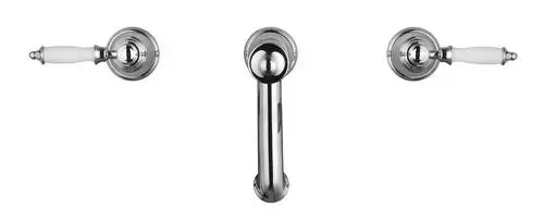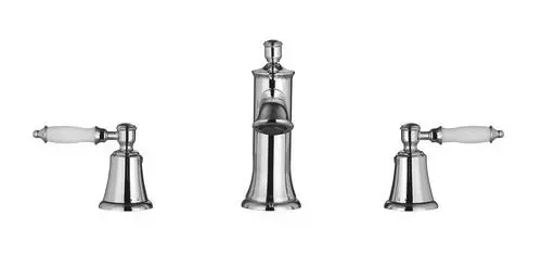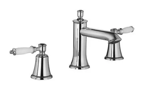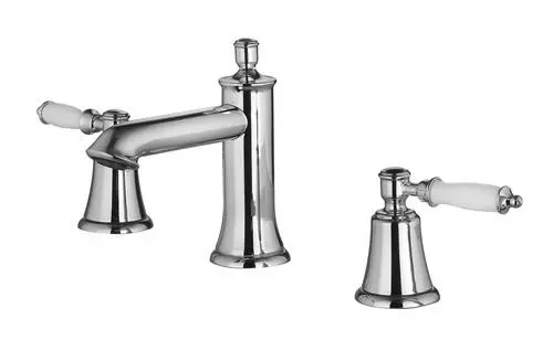 The Tuscany Winterset two-handle widespread bathroom faucet in a polished chrome finish features a 3″ high and 4-1/2″ long solid cast brass spout with interchangeable zinc or ceramic handles. The Winterset is a widespread three hole installation. The pop-up drain assembly is included. This faucet has a flow rate of 1.2 GPM @ 60PSI.